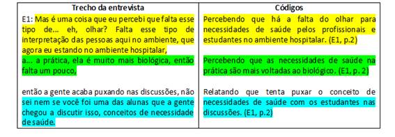 A pesquisa tem abordagem em vertente qualitativa, orientada pelo referencial metodológico da Teoria Fundamentada nos Dados (TFD). Após a aprovação do Comitê de Ética em Pesquisa (CEP) da FAMEMA, sob no 4.468.452 de 16 de dezembro de 2020, o estudo foi conduzido com professores de todas as séries do curso de Medicina, sorteados dentro de cenários previamente selecionados, procurando-se contemplar a abrangência das Unidades educacionais e suas inserções. Para ser incluído na pesquisa, o professor deveria, obrigatoriamente, participar diretamente de pelo menos uma atividade de contato direto com os estudantes da graduação do curso de medicina, independentemente das demais atividades realizadas por ele na FAMEMA. Os critérios de exclusão foram professores que atuassem exclusivamente no curso de enfermagem e/ou nas pós-graduações da instituição, que atuassem esporadicamente com os estudantes através de eletivos, sem estarem integrados ao curso, e os demais professores que não se enquadrassem no critério de inclusão da pesquisa. A participação foi voluntária e com início apenas após leitura e preenchimento do Termo de Consentimento Livre e Esclarecido em versão disponibilizada na plataforma Google Forms. As entrevistas semidirigidas foram conduzidas de forma remota, através de videoconferências, com a presença apenas da primeira pesquisadora e do participante. No início da entrevista, foi realizada uma caracterização com seus dados demográficos e o contexto de ensino em que está inserido, contemplando as diversas unidades educacionais e séries da instituição. Na sequência, era realizada a entrevista semidirigida a partir de duas perguntas disparadoras: “Considerando sua formação acadêmica, prática profissional e experiência como professor(a), 1) Conte-me como você compreende o conceito de necessidades de saúde; 2) Conte-me sua experiência com a abordagem de necessidades de saúde no curso de medicina na Famema, considerando os desempenhos propostos para a formação”, e de um roteiro de entrevista, que buscaram identificar: a compreensão dos professores acerca do conceito de necessidades de saúde; qual o referencial teórico deste conceito que utilizam; quais as experiências teórico-práticas com as necessidades de saúde durante as formações acadêmica e para docência; quais as experiências teórico-práticas na abordagem com os discente no período pré e de pandemia de COVID- 19; quais experiências prévias de docência em outras instituições, e quais suas sugestões e críticas sobre o processo de abordagem das necessidades de saúde no curso de Medicina. O instrumento de análise sócio-demográfica-institucional e o roteiro de entrevista foram validados por meio de quatro entrevistas com professores do curso de enfermagem, pois este também possui um currículo integrado e orientado por competência dialógica e organizado conforme as mesmas unidades e o mesmo método do curso de medicina. As entrevistas foram gravadas em áudio e transcritas na íntegra, passando pelo processo de codificação aberta, que se constitui de identificação, desenvolvimento e correlação dos conceitos. Os demais passos do referencial teórico descritos na TFD, que é um referencial metodológico A TFD é um referencial metodológico utilizado para se entender o fenômeno no ambiente em que ele acontece, com observação direta da relação entre a ação e os significados. A interação entre o próprio dado e o pesquisador fomenta a análise dos dados. Por basear-se na análise dos dados e, ao mesmo tempo, nomear categorias, comparações, fazer perguntas e depreender um esquema integrado e inovador dos dados desarticulados e brutos, pode-se dizer que o método é um exercício de ciência e de criatividade (STRAUSS; CORBIN, 2008). Para a codificação, deve-se identificar, desenvolver e correlacionar os conceitos, blocos de construção da teoria. As categorias, ou subprocessos, são a concepção do fenômeno em seus dados e são a principal unidade da análise na TFD. Desenvolve-se a teoria através do trabalho com categorias, fazendo aparecer a categoria central, normalmente um processo, por consequência. Assim, a TFD objetiva compreender um fenômeno no ambiente em que ocorre, considerando o significado que um determinado contexto representa para o ator em questão a partir da observação direta entre a ação e estes significados, o que possibilita a construção de teorias e de um modelo conceitual que expliquem tal fenômeno, além de identificação das variáveis possivelmente envolvidas no processo (Rieger, 2018; Strauss & Corbin, 2008) Foram realizadas as etapas de Microanálise, Codificação aberta. A próxima etapa será a finalização da codificação axial e da codificação seletiva, de modo a transformar códigos preliminares em códigos conceituais, categorias e, posteriormente, constituir o modelo teórico do fenômeno estudado, normalmente um processo, por consequência (Strauss & Corbin, 2008). Estes passos foram realizados com auxílio de tabelas e cores de um editor de texto, conforme demonstrado abaixo. (Fig.1)