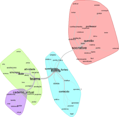 Dessa forma, o corpus textual analisado foi composto de 30 diferentes textos de língua portuguesa e contou com o total de 1.852 ocorrências de 374 diferentes formas lexicais. Toda a codificação do material qualitativo seguiu as orientações presentes em manuais oficiais do IRAMUTEQ ( Salviati, 2017; ). Destaque-se que foram adicionadas como ativas na análise as formas adjetivas, nominais e verbais para processamento via IRAMUTEQ. As demais formas, como artigos e conjunções, permaneceram como suplementares. Diversos recursos e plataformas virtuais foram utilizadas, como o pacote do Microsoft Teams e seus recursos (caderno virtual, biblioteca, questionários via Forms, etc.), além da plataforma Socrative de perguntas e respostas. O objetivo principal com a análise foi compreender o modo como se agruparam as diferentes percepções dos estudantes sobre os recursos didáticos utilizados na disciplina. Para tanto, utilizou-se a análise de similitude, operacionalizada no software IRAMUTEQ. Essa análise possui suas bases na teoria dos grafos e demonstra a forma como as palavras de determinado corpus textual se agrupam e relacionam (Salviati, 2017). Além disso, apresenta as comunidades de palavras presentes em diferentes temáticas. Foram consideradas as 63 palavras mais frequentes no corpus analisado. A contabilização de frequência foi realizada pelo próprio software IRAMUTEQ, variando da forma “teams” com frequência 32 e “praticar” com frequência 3. Foram, ainda, selecionados diferentes segmentos de texto para serem utilizados como evidências empíricas. Tais trechos foram selecionados conforme aderência à temática da categoria/comunidade em discussão. A partir da interpretação da análise de similitude foi possível compreender o conteúdo derivado das percepções dos estudantes sobre os recursos didáticos utilizados no contexto da disciplina ministrada em formato online. A análise de similitude representada na Fig. 2 revela as quatro diferentes comunidades temáticas que emergiram a partir do corpus textual. De início, a comunidade de palavras destacada em vermelho aponta as percepções sobre a utilização da plataforma de perguntas e respostas “Socrative”. De forma geral, é possível afirmar que a plataforma foi bem aceita pelos estudantes, pois diversos comentários positivos envolvendo o “Socrative” foram realizados (interessante, dinâmico, ótimo e bom). Além disso, os estudantes ressaltam que foi possível praticar e testar o conhecimento. Logo, o uso da tal plataforma revela-se como uma escolha acertada à dinâmica online da disciplina, tendo sido importante ao aprendizado e entendimentos dos estudantes sobre o conteúdo ministrado. Ainda sobre o Socrative, diversos comentários de estudantes salientam que a interatividade proporcionada pela plataforma permitiu a ampla discussão com a professora na correção e explicação de questões dos exercícios. O fato de ser uma plataforma virtual e com feedback instantâneo, possibilitou que as dúvidas sobre o conteúdo pudessem ser sanadas quase que instantaneamente. Além disso, muito da percepção positiva dos estudantes em relação ao “Socrative” está relacionado ao modo como a professora da disciplina utilizou a plataforma. Discutir as questões durante a aula síncrona foi uma prática que facilitou o aprendizado e tornou a aula síncrona mais dinâmica e participativa. Já as comunidades de palavras destacadas em verde, azul e roxo abarcam as percepções dos estudantes sobre a utilização do Microsoft Teams e seus recursos na disciplina ministrada de forma online. A comunidade verde apresenta os detalhes sobre a utilização da plataforma Teams. Foram utilizados recursos do Teams tanto para as aulas síncronas (sala de videochamada) quanto para as aulas e atividades assíncronas (aba biblioteca, caderno virtual e questionário via Forms). Um ponto a melhorar, relatado pelos estudantes, envolve a dificuldade de visualizar o prazo para entrega e aviso de que há atividades a serem entregues. Muitos estudantes relataram que apenas ficavam cientes das atividades após aviso da professora da disciplina e que possivelmente perderiam o prazo sem tal aviso, pois a visualização das atividades a entregar e respectivos prazos não foi considerada facilitada na plataforma Teams. A comunidade azul detalha o uso de um recurso específico da plataforma Teams: o questionário via Forms. Por um lado, relatos apontam que esse recurso foi considerado melhor e mais interessante que questionários aplicados na plataforma do Moodle “Aprender 3” (alternativa também utilizada pela UnB). Por outro lado, há relatos que apontam o contrário. Os pontos fortes apontados pelos estudantes sobre a utilização do Forms indicam que o recurso é simples, didático e prático. Dentre os pontos fracos, foram citados a pouca quantidade de questões disponibilizadas, a alta pontuação por questão e o tempo para resposta, que faz com que os estudantes se sintam pressionados e mais suscetíveis ao erro. Não obstante, a percepção geral foi a de que foi uma boa alternativa para aprender o conteúdo e sanar dúvidas. Por fim, a comunidade de palavras destacadas em roxo revela percepções sobre a utilização do Caderno virtual, recurso utilizado no contexto da plataforma Teams. Os relatos dos estudantes são bastante positivos, reforçando que esse recurso ajudou na organização de anotações, tarefas e tópicos estudados na disciplina. Muitos estudantes relataram que nunca haviam utilizado tal recurso do Teams. Interessante destacar que, em aulas presenciais, a utilização de um caderno para anotações é algo comum e esperado. Porém, no contexto de ensino remoto, muitos estudantes podem não sentir motivação ou a necessidade de manter um caderno físico (ainda que seja importante). Nesse sentido, a utilização do caderno virtual torna-se uma prática mais dinâmica e motivadora, possibilitand