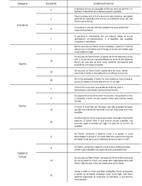 Não é tão simples, para os docentes e, tampouco, para os estudantes, nos mantermos motivados com as aulas, totalmente, online por um período de 4 semestres consecutivos. Assim, a sala de aula virtual, criada na Equipe do Teams, do O365, permitiu a interação entre a professora e os estudantes, principalmente, com o uso das Guias “Postagens” e “Caderno”. O recurso tecnológico do Socrative, largamente utilizado em pesquisas das diferentes áreas do conhecimento (Christianson, 2020; Fraile et al., 2021; Romero et al., 2021; Wahyuningsih et al., 2021) também se mostrou inovador, no sentido de manter a atenção do aluno, durante a realização dos questionários, por permitir o feedback imediato a cada resposta do aluno. A possibilidade de se manter oculto, o nome do aluno, pode ter sido a causa da participação, efetiva, dos alunos nas aulas síncronas em que se utilizou o Socrative.