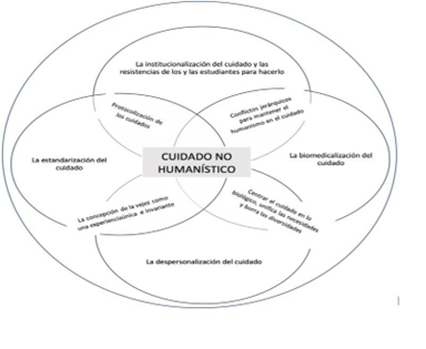 La categoría central que emergió fue "Cuidado no humanístico" ya que se identificó que la organización e implementación de los cuidados obedece a cuestiones administrativas y protocolizadas desde una perspectiva biomédica y no al reconocimiento de la singularidad de las personas y de sus necesidades desde un aspecto holístico o de la priorización que hacían desde sus propios valores. A continuación, se desarrollan las categorías que aportaron a la construcción de esta categoría central.