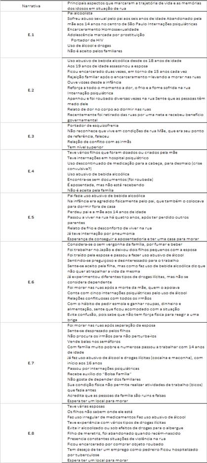 A partir das narrativas dos idosos em situação de rua, foi possível observar uma trajetória de intenso sofrimento em todas as fases da vida. No Quadro 1, encontram-se em destaque os principais aspectos que marcaram a vida dos entrevistados.