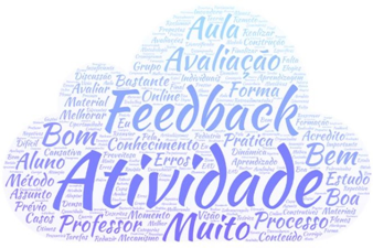 Um ponto crucial, em consequência da pandemia, foi a interrupção das atividades práticas com pacientes para os alunos da graduação, que antecediam o internato. A despeito da perda nos vários cenários, o clímax da mudança da disciplina (nos últimos três anos) foi a introdução sistemática do feedback em quase todas as avaliações. No início de cada atividade teórica, abria-se um espaço para esclarecimento das dúvidas sobre o teste anterior. As atividades assíncronas seguiram o mesmo estilo: postagem dos estudantes na plataforma e feedback por escrito, assim como nos podcasts. Apenas nos seminários os feedbacks eram imediatos. A devolutiva das atividades elevou o nível das discussões e de exigência dos docentes e estudantes, ao ponto de estes últimos demandarem o feedback quando, eventualmente, ele não ocorria. A coleta dos dados aconteceu de forma virtual, com envio de um questionário (Google Forms) para os alunos, logo após o término da disciplina. O questionário semiestruturado foi composto de dados demográficos sobre os estudantes participantes, bem como de 11 questões abertas, e foi elaborado enfatizando a percepção dos alunos sobre avaliação, feedback e o método utilizado na disciplina EaD. Para tratamento e análise dos dados, foi aplicada a técnica de análise de conteúdo de Bardin (2016): pré- análise, exploração do material, tratamento e interpretação. Na pré-análise (primeira etapa), o conteúdo textual do questionário foi separado, de modo que os dados relevantes fossem coletados, objetivando organizar as impressões principais. Foi possível, assim, acompanhar as respostas e sintetizar as ideias- chave da pesquisa, definindo quais seriam os objetivos e as formas de abordagem. Uma nuvem de palavras foi construída para auxiliar o seguimento das etapas, utilizando o software WordArt, que fez uma análise da repetição de termos nas falas dos participantes e os organizou conforme a figura abaixo.