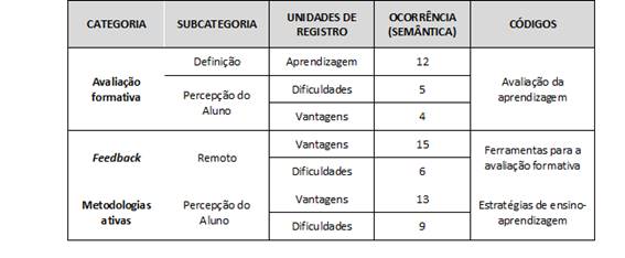 A partir dessa nuvem de palavras, foi aprofundado o embasamento teórico sobre os termos que se destacaram, e o material coletado pôde ser melhor explorado (segunda etapa), culminando na codificação de categorias e subcategorias temáticas, utilizando a semântica (semelhanças e diferenças do significado dos vocábulos presentes no conteúdo analisado) de modo dedutivo. Essa etapa permitiu resumir os dados em um quadro, objetivando melhor organização e clareza.