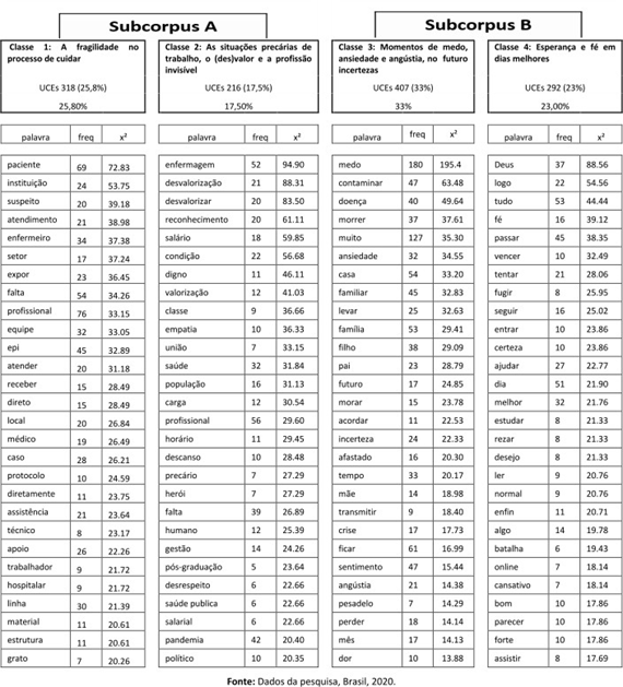 A análise do corpus processado no software IRaMuTeQ® deu-se em 32 segundos, gerou 1.294 Unidades de Contexto Elementar (UCE), das quais 1.233 foram aproveitadas 95,3%. A partir de matrizes e cruzamentos dos segmentos de textos e palavras, foi aplicado o método da Classificação Hierárquica Descendente (CHD) e obteve-se quatro classes em dois subcorpus: “A” - intitulado “Trabalho” composto pelas classes 1 (A fragilidade no processo de cuidar) e 2 (As situações precárias de trabalho, o (des)valor e a profissão invisível), com 216 (17,5%) e 318 (23,68%) das UCE do corpus total, respectivamente. O subcorpus “B”, intitulado “Sentimentos” contém os relatos correspondentes às classes 3 (Momentos de medo, ansiedade e angústia, no futuro incertezas) e 4 (Esperança e fé em dias melhores), com 407 (33%) e 292 (23,7%) das UCE, do corpus total, respectivamente (Quadro 1).