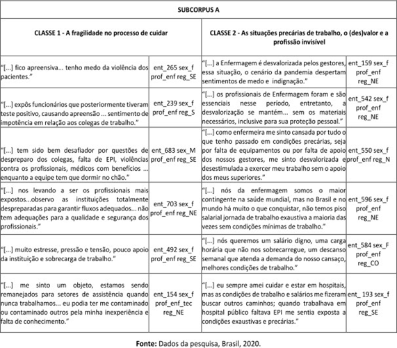 No subcorpus “A”, na perspectiva dos profissionais de enfermagem, foram revelados conteúdos das RS frente ao processo de trabalho, como a sociedade percebe a participação desses profissionais no novo contexto da pandemia, na relação com o paciente infectado e frente às instituições para as quais prestam serviço. Nessa relação, referem sentimento de impotência, medo do desconhecido, exaustão e aflição ao prestar cuidado, que advém das próprias condições de trabalho oferecidas. Os impactos na saúde mental são compreendidos e justificados pelos profissionais em função da estrutura institucional que combina duas formas de exploração: a sobrecarga e a intensificação do trabalho, nas constantes mudanças de setor que geram sentimentos de insatisfação, insegurança e incertezas, nos novos protocolos técnicos que precisam dominar para cuidar da população (Classe 1). Considerando que as condições para o desenvolvimento do trabalho não são adequadas, os profissionais se expõem aos riscos no exercício de suas ações e, fragilizados, se sentem desvalorizados e com medo de sofrerem violência provocada por pacientes e familiares não empáticos diante do trabalho que estão desenvolvendo (Classe 2), conforme mostra a quadro 2.