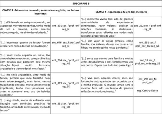 O subcorpus “B” revela as emoções e medidas de enfrentamento, manifestações de sofrimento no âmbito da saúde mental e os impactos negativos na qualidade de vida e nos níveis de satisfação dos profissionais. Embora sofrendo, verbalizam o desejo de lutar e de transformar uma realidade, mas se sentem (des)esperançosos no futuro em função do presente marcado pelo sentimento de desamparo que a profissão vive. Sozinhos, buscam no suporte emocional de suas redes pessoais, compostas por colegas que passaram e/ou permanecem suportando uma situação de desgaste no trabalho, a validação e legitimação de sua dor e acolhimento emocional. Ainda refletem que é preciso valorizar os momentos simples e prazerosos da vida, zelar por suas relações interpessoais, creditam à ajuda Divina e às evidências científicas soluções ao sofrimento (Quadro 3).