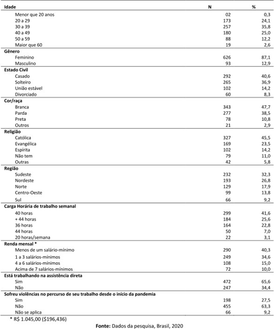 São Técnicos de Enfermagem (20%), Enfermeiros (47,2%), Obstetrizes (0,5%), Enfermeiros docente- pesquisadores (15%), Enfermeiros Pós-graduandos (13,4%), Enfermeiros especializando (3,7%). Atuam simultaneamente em duas categorias profissionais (3,6%) Técnico de Enfermagem e Enfermeiro. A Tabela 1 retrata o perfil sociodemográfico, clínico e laboral de 719 participantes que responderam a pesquisa em ambiente virtual.