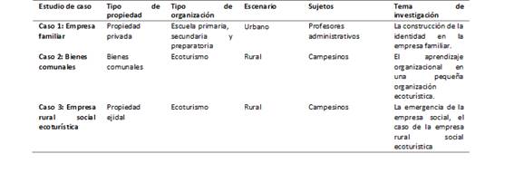 Desde la perspectiva de los Estudios Organizacionales, el uso de la metodología cualitativa y sus diferentes técnicas; y en este caso la entrevista ha abierto la comprensión del mundo simbólico de las organizaciones para interpretar su dinámica. La entrevista es el medio que permite examinar cómo los textos orales o escritos funcionan dentro de la práctica sociocultural. El análisis del discurso es un dispositivo que da fundamento a la existencia misma del lenguaje a través de un conjunto conectado de declaraciones, conceptos, términos y expresiones que constituyen una forma de hablar y escribir sobre un tema en particular (Ocampo-Salazar et al., 2016). En este sentido, en el presente apartado se exhibirán los tres estudios de caso centrándonos en la entrevista y su análisis como la técnica que permite recuperar significados sociales y poner evidencia la construcción de sentido en una relación comunicacional. Para ejemplificar lo mencionado, se presentan tres estudios de casos; 1) una empresa familiar (González, 2014), 2) un proyecto productivo de bienes comunales (González, 2015) y 3) una empresa rural social ecoturística (González et al., 2019) (ver tabla 3).