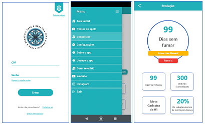 A versão teste do TabCess apresenta as seguintes telas e funções: CADASTRO; TELA INICIAL (comandos para o paciente marcar se fumou, não fumou ou teve “fissura”, além da possibilidade de escrever o que sentia); BENEFÍCIOS DA CESSAÇÃO DO TABAGISMO (informações sobre os benefícios a curto, médio e longo prazo); PREJUÍZOS DO TABAGISMO (informações sobre problemas cardíacos, gravidez e tabagismo, impotência sexual, apnéia obstrutiva do sono além dos malefícios do cigarro eletrônico); EVOLUÇÃO (mostra dias sem fumar, dinheiro economizado e atividade física); CADASTRO DE METAS (cadastro das metas relacionadas a parar de fumar, alimentação, atividade física, lazer e trabalho); LINKS ÚTEIS (links com informações sobre combate ao tabagismo); CONQUISTAS (acompanhamento do alcance das metas cadastradas); CONFIGURAÇÕES (tela para configurar o aplicativo de acordo com as notificações que deseja receber); SOBRE O APP (texto informativo sobre o aplicativo); USANDO O APP (vídeo informativo sobre como usar as funcionalidades do aplicativo, registro e acompanhamento dos dados de consumo e fissura); RELATÓRIO (dados gerais e resultados do paciente); YOU TUBE (nessa tela, o usuário é direcionado para o canal do Youtube do aplicativo para acessar outras informações e vídeos do aplicativo); e INSTAGRAM (direciona ao Instagram do aplicativo).