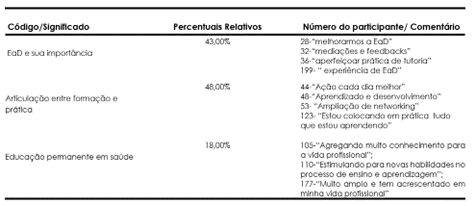Vale destacar, de maneira geral, que o perfil dos participantes, neste estudo, se caracteriza: quanto a função 80% são tutores e 20% são supervisores; quanto a formação: a maioria tem curso de pós-graduação Stricto Senso; quanto ao gênero: 82% é do sexo feminino, 16% do sexo masculino e 2% não binário. Para obtenção de temas e subtemas, respostas semelhantes foram agrupadas e numeradas em ordem crescente. Resultando em três significados/códigos. Na tabela 1 são descritos os mesmos, como seus percentuais relativos e alguns exemplos de comentários semelhantes com o número do participante (1 a 200).
