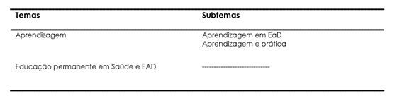 3.Nesta etapa foram selecionados os temas mais abrangentes. Aqueles que foram encontrados com maior frequência foram: aprendizagem (48%) e educação permanente em saúde e EaD (43%).