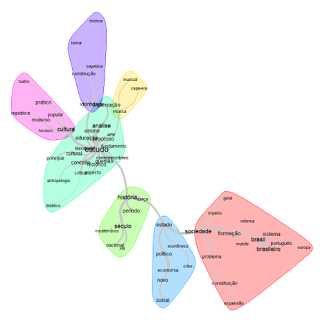 E ainda na Figura 1, o halo vermelho, originado pelo termo "sociedade", que foi um dos mais representativos no corpus, também abordou essa perceptiva. Este, foi constituído também pelas palavras "império, formação, problema, geral, reforma, mundo, constituição, Brasil, expansão, sistema, brasileiro, português e Europa". Neste conjunto observou-se que dois temas centrais e paralelos destacaram-se. O primeiro deles foi o Império Português e as influências europeias na constituição da sociedade brasileira, inclusive nos problemas que ela enfrenta até hoje. E o outro foi o estudo dos sistemas e reformas educacionais brasileiras, segundo as perspectivas histórica e organizacional.