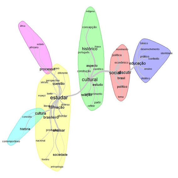 O halo verde, também da Figura 2, por sua vez, evidenciou como central a palavra “cultural” e a partir dela, os demais termos que compuseram o grupo foram “estudo, relação, conhecimento, aspecto, histórico, concepção, construção, partir, refletir, científico, língua, português, indígena”. Diante disso, foi possível inferir que outra ênfase do corpus analisado está no estudo de elementos históricos que influenciam a construção da concepção de língua prevalente hoje e como tais aspectos tiveram impacto também no contexto cultural. Levando em conta além de elementos de influência africana, outros de origem indígena.