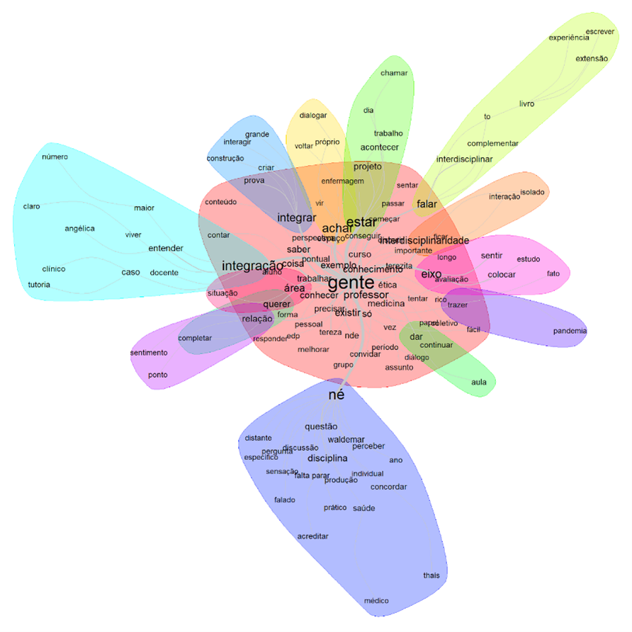 Segundo Schneider, Kerwin, Frechtling & Vivari (2002), os debates on-line síncronos, quando avaliados a partir do viés do presencial, apresentam comentários curtos ou somente concordâncias com as opiniões já formadas e explicitadas. Contudo, essa situação não foi observada na realização das reuniões no Google Meet deste estudo, nos quais houve formação de conflitos enriquecedores e consequentes discussões calorosas devido a opiniões plurais. A Fig. 1 comprova a riqueza de falas através de uma Análise de Similitude do IRAMUTEQ nos discursos.