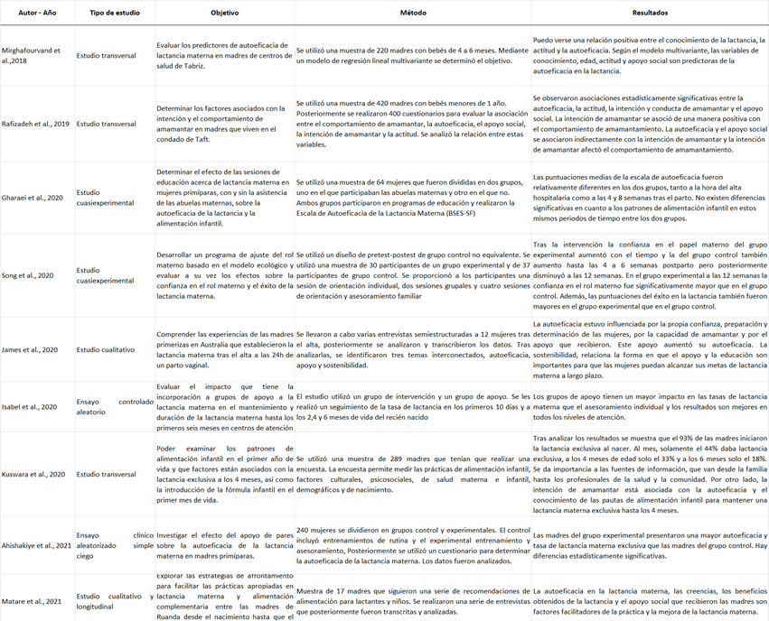 Los criterios de inclusión fueron artículos que investigan sobre la mejora de la autoeficacia de la lactancia materna en madres que tuvieran un apoyo social, escritos en inglés o en castellano, con acceso a texto completo y publicados en los últimos cinco años.
