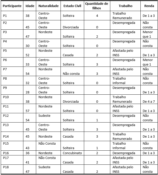 O quadro 1 apresentada demonstra o perfil das participantes do estudo quanto aos aspectos sociodemográficos. Nele pode-se observar a média de idade de 42,5 anos e o desvio padrão de 8,6 anos, com média de 1,5 filhos e desvio padrão de 1,3, mais da metade solteiras. Apenas cinco mulheres trabalhavam na ocasião da pesquisa. Observa-se ainda uma renda baixa, em que apenas uma participante apresentou o maior nível salarial (4 a 7 salários mínimos).
