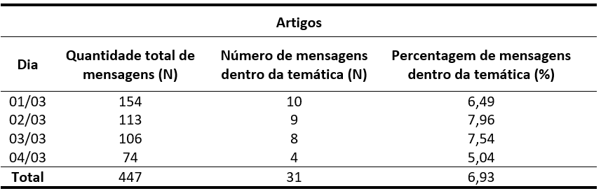 Os resultados obtidos, em quatro dias de coleta de dados, apontaram 31 (6,93%) relatos relacionados à temática “dificuldades no processo de cessação do tabagismo”, dentre as 447 mensagens analisadas. A média de mensagens postadas por dia no aplicativo foi de 112; destas, uma média de 8 mensagens por dia dizem respeito a percepção do usuário da app sobre a dificuldade no processo de cessação do tabagismo (Tabela 1).