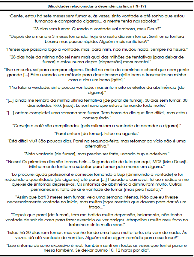 A análise qualitativa do conteúdo das mensagens levou a identificação duas categorias relacionadas às dificuldades encontradas no processo de cessação do tabagismo pelos participantes do “fórum de discussão” do “QuitNow!”, quais sejam: “dificuldades relacionadas à dependência física” (Tabela 2) e “dificuldades relacionadas à dependência psicológica e à mudança de comportamentos” (Tabela 3).