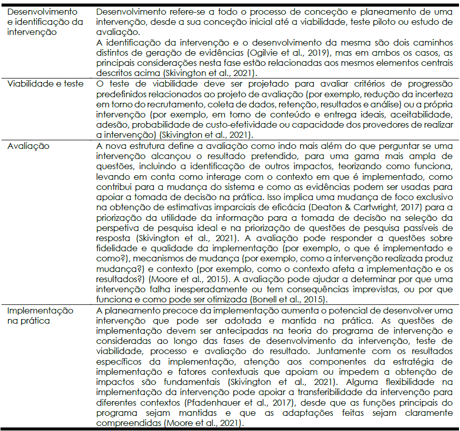 Como observam Thirsk e Clark (2017) as intervenções de saúde precisam ser compreendidas de forma a responder à complexidade dos programas, das pessoas e dos lugares. Para tal, a investigação qualitativa e os esforços de métodos mistos tentam superar os limites da pesquisa baseada em medições. Ao contrário dos métodos quantitativos, o objetivo da investigação qualitativa é explorar, narrar e explicar os fenómenos e dar sentido à complexa realidade (Renjith et al., 2021; Yardley, Bradbury, & Morrison, 2021). As quatro fases no desenvolvimento e avaliação de intervenções complexas, do guia do MRC, revisto por Skivington et al., (2021) podem ser observadas na tabela 1 (Skivington et al., 2021).