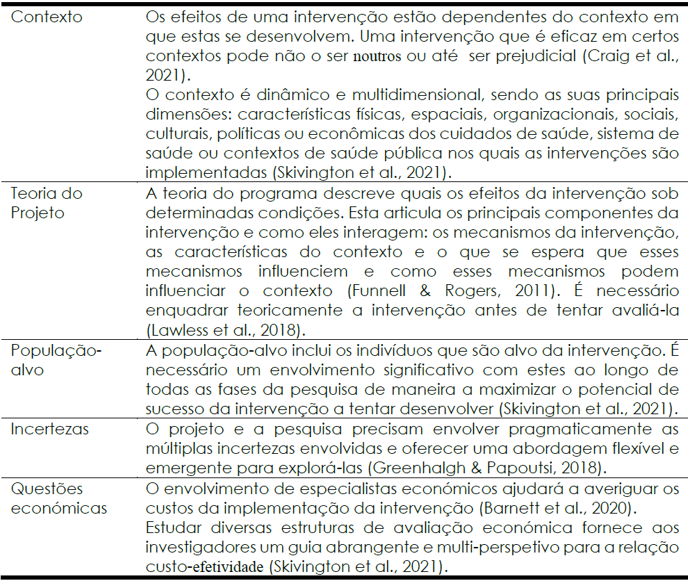 Os estudos sobre a orientação prática para os profissionais de saúde e investigadores que expliquem os estágios essenciais do desenho da intervenção são escassos (Wight et al., 2016). E apesar de haver um acordo generalizado sobre a importância da estrutura conceptual, os investigadores frequentemente preocupam-se mais com a validade interna da experiência do que a construção de intervenções válidas, com envolvimento dos destinatários dos cuidados, até para a compreensão de como a intervenção pode ser adaptada/adequada ao ambiente da prática clínica e ao contexto específico, com os seus determinantes sociais, culturais, económicos e de políticas de saúde (Wight et al., 2016; O'Cathain et al., 2019).