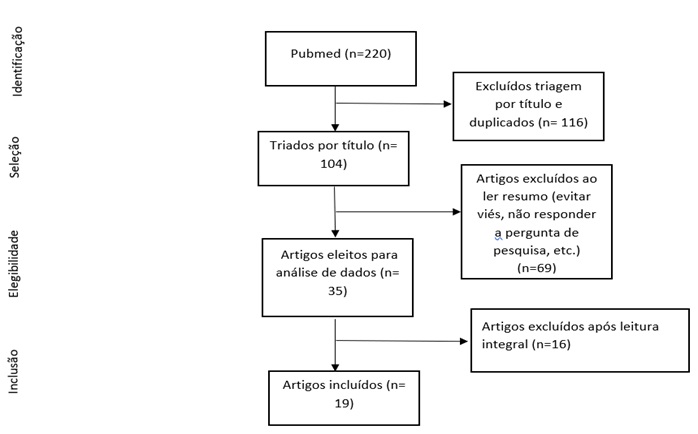 A busca resultou em 220 produções, destas, 35 permaneceram após a leitura do título e resumo. 16 artigos foram excluídos por não contemplarem os demais critérios de inclusão. Sendo então, após revisão por pares (duplo-cego), a amostra final ficou contemplada por 19 artigos científicos (figura 1).