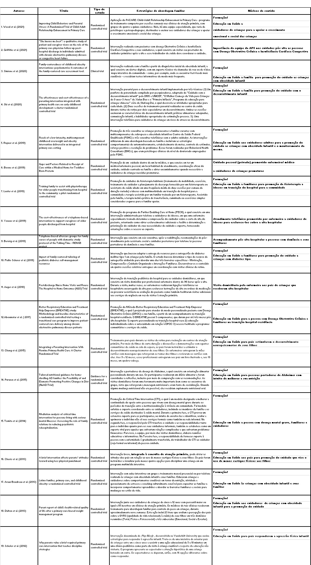 Os núcleos de sentido identificados no quadro 1, compuseram os temas Formação/Educação em Saúde às pessoas a serem cuidadas e a seus cuidadores e a Promoção do Cuidado centrado na família, indicando que essas foram as estratégias encontradas na revisão integrativa para abordagem familiar.