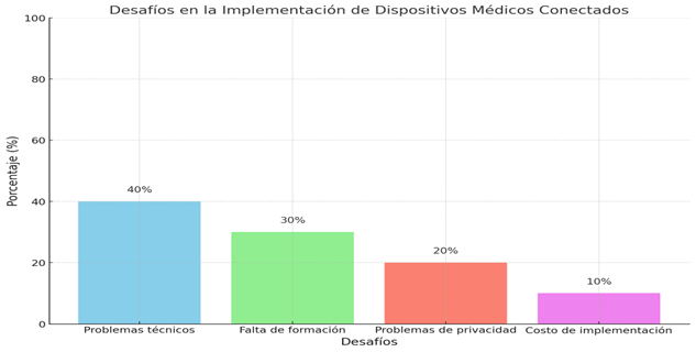 Desafíos en la Implementación: La gráfica destaca los principales desafíos enfrentados en la implementación de dispositivos médicos conectados, siendo los problemas técnicos el mayor desafío (40%), seguidos por la falta de formación del personal (30%), problemas de privacidad y seguridad de datos (20%), y el costo de implementación (10%). Estos desafíos subrayan las áreas que necesitan atención y mejoras para facilitar una adopción más amplia y efectiva de la tecnología.