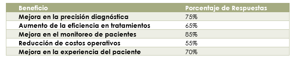Principales Beneficios Percibidos: Los profesionales de la salud encuestados identificaron como principales beneficios de los dispositivos médicos conectados la mejora en el monitoreo de pacientes (85%), la mejora en la precisión diagnóstica (75%), y la mejora en la experiencia del paciente (70%). Estos resultados subrayan la percepción positiva de la tecnología y su impacto en la eficiencia y calidad de la atención médica.