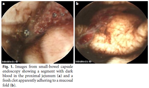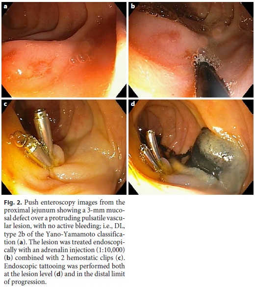Upper gastrointestinal endoscopy and colonoscopy were normal. Random biopsies of the gastric and duodenal mucosa revealed no significant findings. Small-bowel capsule endoscopy identified, within a segment with dark blood in the proximal jejunum, a fresh clot apparently adhering to a mucosal fold (Fig. 1a, b). Push enteroscopy detected, in this location, a 3-mm mucosal defect over a protruding pulsatile vascular lesion, with no active bleeding (Fig. 2a). This was consistent with a DL, type 2b of the Yano-Yamamoto classification, which was treated endoscopically with an adrenalin injection (1: 10,000) combined with 2 hemostatic clips (Fig. 2b, c). Endoscopic tattooing was performed both at the lesion level (Fig. 2d) and in the distal limit of progression.