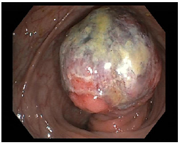 Fig. 1 Endoscopic image showing a voluminous pedunculated colonic lesion with superficial ulceration.