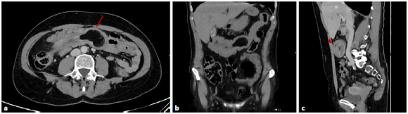 Fig. 2 CT image in axial (a), coronal (b), and sagittal (c) views showing an endoluminal homogeneous fat density lesion, located in the transverse colon (arrow), that corresponds to a colonic lipoma. Proximal to the mass, a “donut”-like image is identified (arrowhead), and the colonic lumen is filled with mesenteric fat and blood vessels. The findings are consistent with a colocolic intussusception.