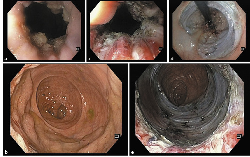 Fig. 2 a Adenoma in the rectum involving the anorectal junction. b Rectal lesion occupying more than 75% of the circumference. c Dissection in the anal canal. d Retroflexed view of the mucosal defect. e Mucosal defect in the rectum and anal canal.