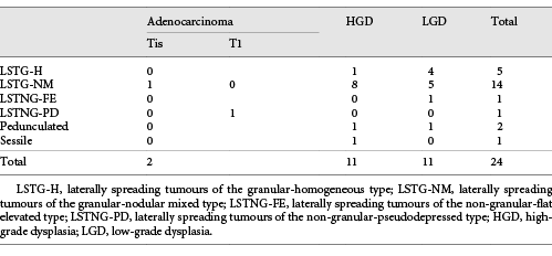 A malignant lesion was considered whenever invasion was present, either intramucosal (Tis lesions, defined as lesions with invasion into the lamina propria or muscularis mucosa) or submucosal (T1 lesions). Due to the clear differences regarding clinical significance, management, and outcomes, we analysed these groups separately.