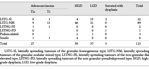 Regarding pathological evaluation, 29 (20%) were adenocarcinomas (12 intramucosal and 17 submucosal adenocarcinomas [5 of them with >SM1 invasion]), the remaining being high-grade dysplasia (n = 67), low-grade dysplasia (n = 48), and serrated with dysplasia (n = 3). The relationship between morphology and histology can be analysed in Tables 1 and 2.
