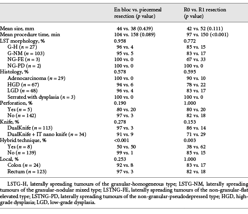 Among the R0 resections, the lesions that did not fulfil the curative criteria were 1 colonic LST with submucosal adenocarcinoma >SM1 and budding (that was operated, without lesion in the surgical specimen - T0N0), 2 SM1 rectal adenocarcinomas with vascular permeation (that were operated, without lesion in the surgical specimen - T0N0), 1 >SM1 rectal submucosal adenocarcinoma (under surveillance, no residual lesion after 1 year), 1 SM1 rectal adenocarcinoma with tumour budding (that was operated, without lesion in the surgical specimen - T0N0), and 1 rectal LST with submucosal adenocarcinoma >SM1 and budding (that was operated, without lesion in the wall but 1 positive lymph node - T0N1). The only risk factor significantly associated both with piecemeal and R1 resection was performance of the hybrid technique, while longer procedures were also associated with R1 resections (Table 3).