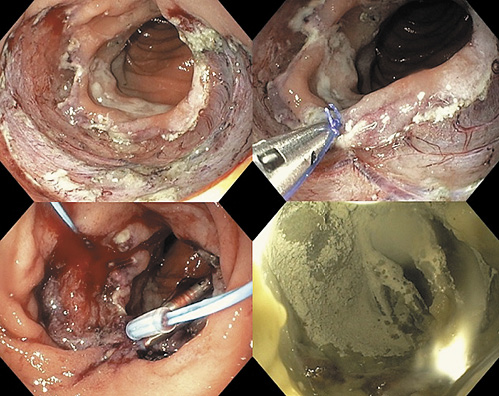 Besides the high-risk of adverse events during the procedure, duodenal ESD has a high risk of late adverse events, due to the exposure of the muscular layer to biliary and pancreatic juices. Therefore, we attempted to close the defect by the string-clip suturing method [2]. First, a clip with a string was passed into the endoscopic channel and displaced in the anal side of the ulcer. Then, a second clip was hooked in the string and displaced in the opposite (oral) side, and the two clips were gathered by pulling the string. After approaching the two margins, we tried to achieve the complete closure. Unfortunately, we were only able to close half of the defect, due to the poor mobility of the duodenum. In order to offer some protection to the muscle layer, we decided to prophylactically apply hemospray in the open area of the ulcer (Fig. 3).