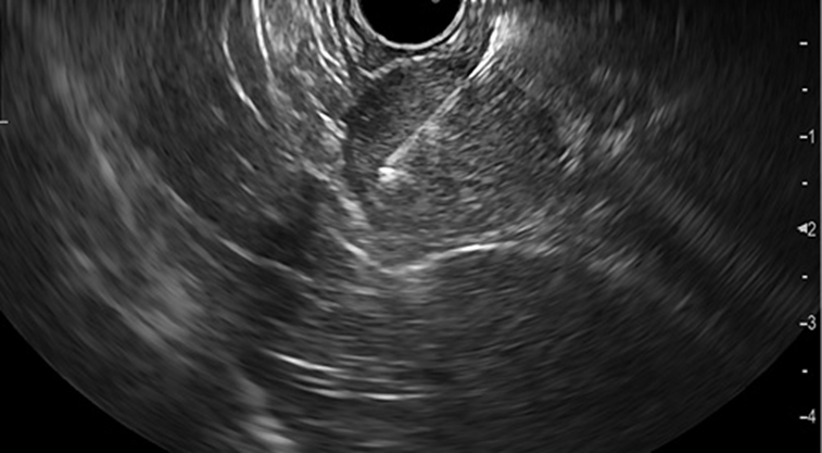 Fig. 2: EUS showing a 25-mm hypoechogenic subepithelial gastric lesion originating in the muscularis propria.
