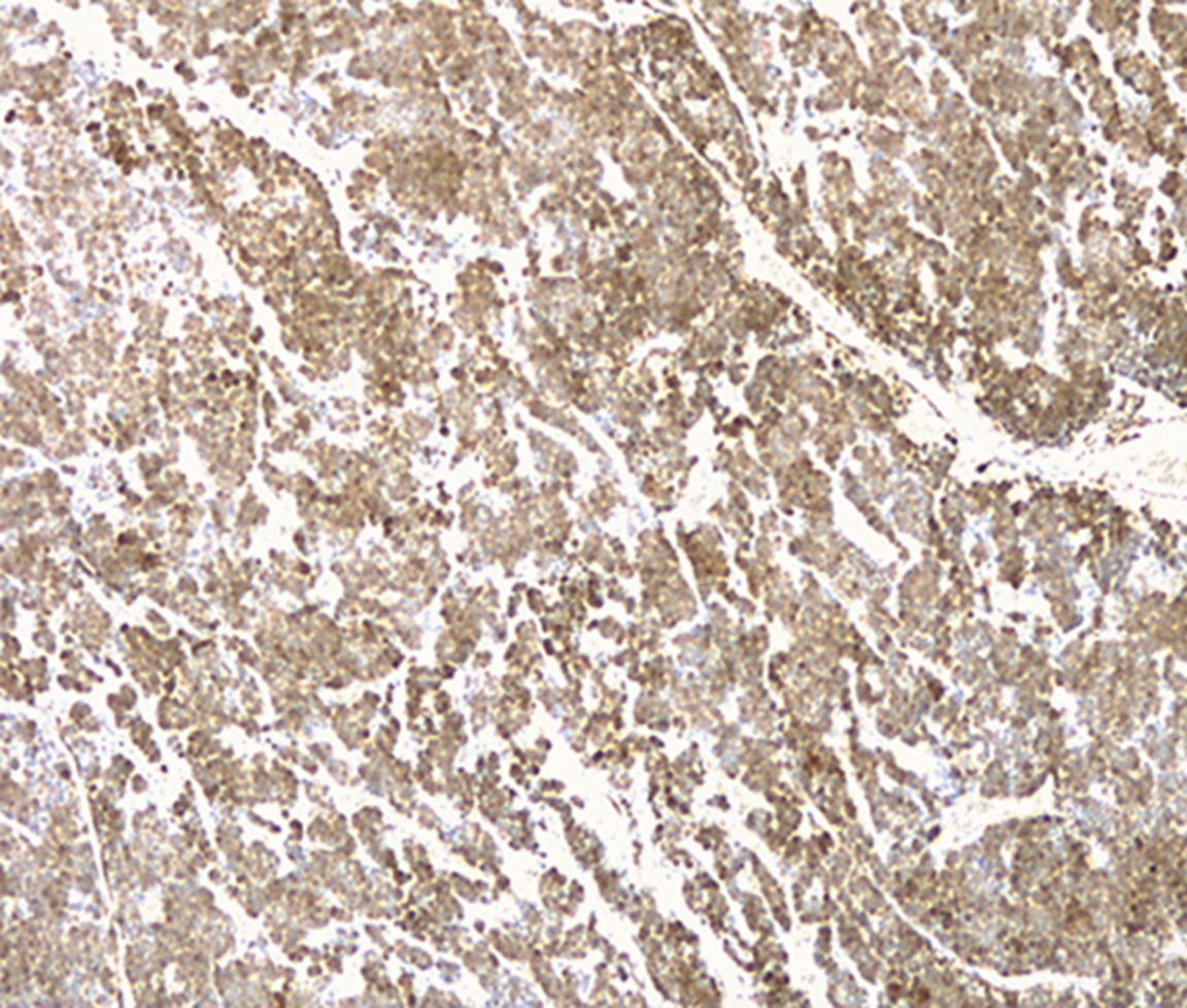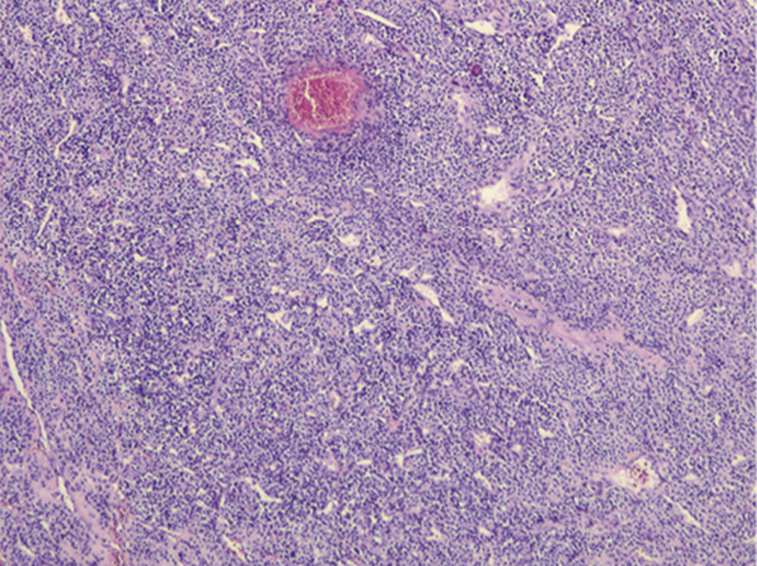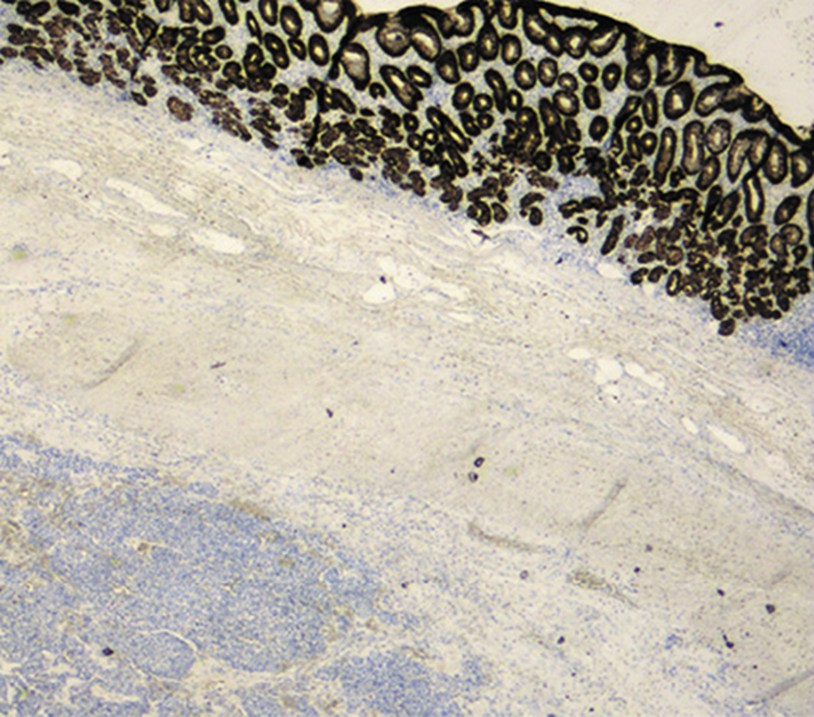 A 37-year-old leucodermic woman with no relevant past history presented with 1-month history of new-onset epigastric pain and bloating. She denied any other symptoms. She underwent an esophagogastroduodenoscopy that revealed a 25-mm subepithelial lesion in the gastric antrum (Fig. 1). Tunnel biopsies were done and were unrevealing. She underwent an endoscopic ultrasound (EUS) that showed a 25-mm hypoechogenic subepithelial lesion originating in the muscularis propria (Fig. 2). EUS-guided fine-needle aspiration (FNA) with a 25-G needle (Boston Scientific®) was performed (2× passes using suction technique), revealing cell nests without atypia, that were focally positive for smooth-muscle actin and synaptophysin, and negative for chromogranin and CD117. KIT and PDGFRA mutations were also negative. Unfortunately, the sample was inadequate for further study. A staging CT was performed excluding distant metastasis. Since investigations thus far were inadequate to exclude a malignant process, she underwent laparoscopic-wedge gastrectomy. Histopathology revealed a solid, epithelioid, and richly vascular tumor without cellular atypia (Fig. 3). Immunohistochemistry was similar to that previously performed and complemented with positive calponin (Fig. 4) and negative cytokeratin AE1/AE3 (Fig. 5), making the diagnosis of a glomus tumor.