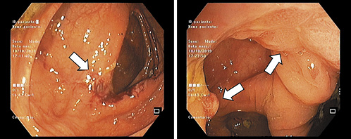 A decision was made to repeat colonoscopy with lesion sampling at our center. At this procedure, an area of irregular mucosa with approximately 15 mm adjacent to the ileocecal valve was observed (Fig. 1a). This lesion had a congestive appearance, with superficially ulcerated areas and a pseudo-polypoid component. On the hepatic flexure, additional areas of mucosa ranging from 5 to 10 mm with similar characteristics were seen (Fig. 1b). The remaining colon segments had no endoscopic abnormalities. The first endoscopic impression was of an ischemic or drug-induced colopathy, but the patient had neither a history of cardiovascular risk factors nor a regular consumption of drugs associated with colorectal mucosal disruption.