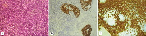 Fig. 2 Histological images. a Infiltration of the colonic mucosa by atypical lymphoid cells. HE. ×40. b Immunohistochemical staining for cytokeratin AE1/AE3. ×40. c Immunohistochemical staining for CD20. ×40.