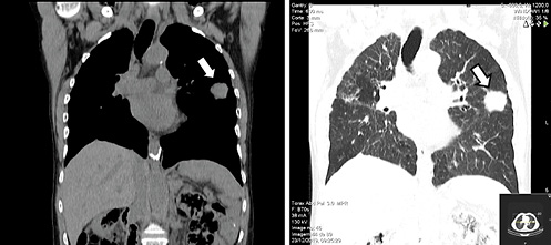 Fig. 3 Thoracic CT scan showing the larger pulmonary lesion in the superior left lobe (white arrows).