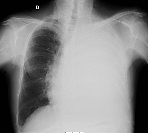 On physical examination, his vital signs were stable and he had no signs of respiratory distress. On pulmonary evaluation, the patient exhibited dullness to percussion and absent breath sounds on the left hemithorax. Blood studies were unremarkable. Chest radiograph showed hypotransparency of the whole left hemithorax (Fig. 1).