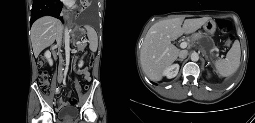 A 61-year-old man was admitted to the emergency department with an insidious history of shortness of breath, malaise, loss of weight (7 kg), and anorexia in the previous 6 weeks. He denied chest pain, cough, fever, abdominal pain, or diarrhea. Past medical conditions included arterial hypertension, diabetes mellitus type 2, and dyslipidemia. Chronic medications included acetylsalicylic acid, valsartan, atorvastatin, and metformin. He denied smoking and re-ported an alcohol intake of 20 g a week. He denied past history of acute pancreatitis or trauma and his family history was irrelevant.