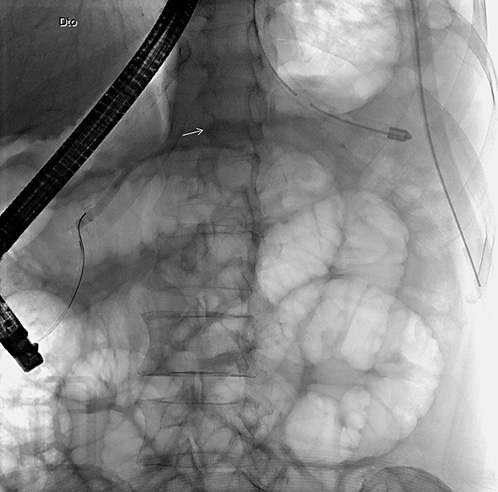 Fig. 3 Wirsungogram performed on the first endoscopic retrograde cholangiopancreatography, revealing a ductal leakage in the body of pancreas (white arrow).