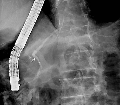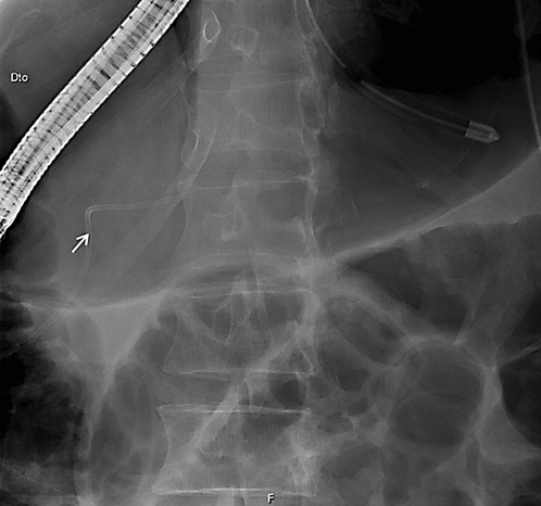Fig. 4 Radiograph showing the pancreatic plastic stent after endoscopic retrograde cholangiopancreatography.