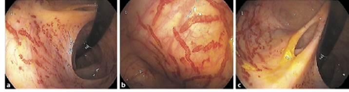 Fig. 1 a Flat, red, bright, linear marks with well-defined boundaries are shown in the ascending colon and cecum. b The dotted surface suggests intraparietal bleeding. c Relationships with the ileocecal valve.