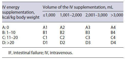 According to the European Society for Clinical Nutrition and Metabolism (ESPEN), intestinal failure (IF) is defined as the reduction in gut function below the minimum necessary for the absorption of macronutrients and/or water and electrolytes, such that intravenous supplementation (IVS) is required to maintain health and/or growth [1]. IF can be classified according to functional, pathophysiological, and clinical features. From a functional perspective, IF can be classified into three types. In type I, short-term IF, IVS is usually required over a period of days to a few weeks. Type II is a long-term, subacute condition, where IVS is maintained for weeks/months, and type III is a chronic condition, with metabolically stable patients requiring IVS over years, sometimes during all their lives [1, 2]. Regarding pathophysiological classification, there are five major pathophysiological mechanisms for IF: short bowel, intestinal fistula, extensive small bowel mucosal disease, intestinal dysmotility, and mechanical obstruction. From a clinical perspective, classification is based on the weekly IVS energy and volume requirement. It can be categorized from A to D regarding the IVS energy supplied weekly, and from 1 to 4 for the volume of the IVS [1]. The clinical classification is illustrated in Table 1.