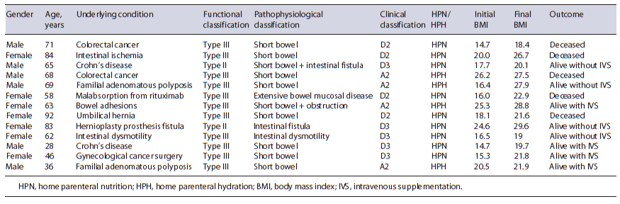 The mean duration of HPN/HPH was 23 months. HPN was administered for a mean period of 6.2 days/week and HPH for a mean of 4.6 days/week. Table 3 summarizes HPH/HPH support characteristics and duration for each patient. All patients improved their BMI during the follow-up period (mean BMI at the beginning of follow-up 18.9 vs. 23.5 at the end, p < 0.001). Regarding clinical outcome at the end of follow-up, 4 patients (30.8%) were alive without IVS, 4 patients (30.8%) maintained IVS, and the other 5 patients (38.4%) died (Table 2).