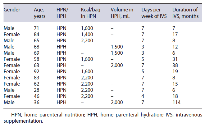 This study presented some limitations. It was carried out in a single hospital, data collection was dependent on each patient’s clinical files, and the study population was small, in relation to the rarity of this clinical entity. Also, long-term complications from HPN such as cholestasis, liver disease, and osteoporosis were not accessed. Nevertheless, the present study suggests that, even in a health system where there is no tradition of long-term management of IF patients and with only a few teams with some experience, home parenteral support can be a safe and effective therapy.
