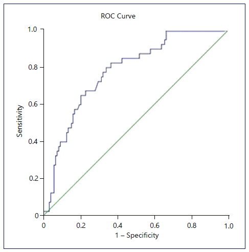 PCCRCi was more frequent in the proximal colon (aOR = 3.01, p = 0.014), and the risk of PCCRCi is associated with the presence of 2 CVRFs (aOR = 7.50, p = 0.016), cholecystectomy in the past (aOR = 10.09, p = 0.019), and family history of CRC in a first-degree relative (aOR = 4.25, p = 0.006). Marginally significant results for the association of PCCRCi with 3 CVRFs (aOR = 4.71, p = 0.072) and 4 CVRFs (aOR = 5.89, p = 0.075). These results suggest that the main threshold for increased chance of PCCRCi is two or more CVRFs. Moreover, isolated CVRF analysis revealed a protective effect for the absence of all CVRFs (aOR = 20; CI 95% 0.05-0.89; p = 0.034). Nagelkerke R2 of 0.236 showed moderate quality. Hosmer-Lemeshow test was nonsignificant (p = 0.273), suggesting a good fit. Bootstrap 1,000 samples were used for model validation confirming significance for the previously identified variables. The ROC curve (Fig. 1) associated with the multivariate model was created, and an area under the curve was 77.8% (p < 0.001) suggesting a moderate precision for the adjusted model.